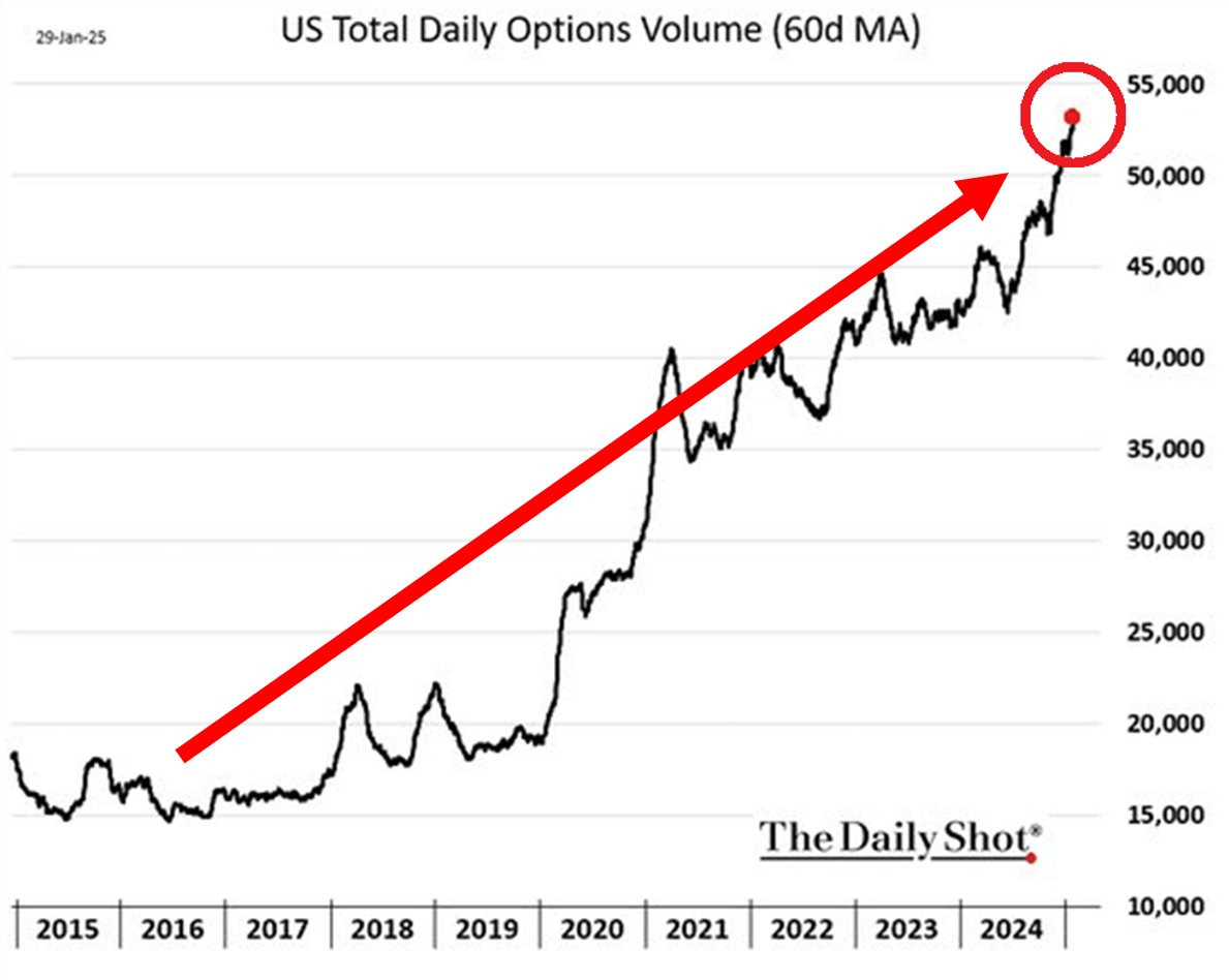 BONUS CHART: Options were introduced so that institutions could hedge their portfolios against extreme drawdowns and generate extra income for those with long-term portfolios. However, post-COVID, options have become a gambling’s den, especially with the launch of 0DTE options, as volumes have exploded.