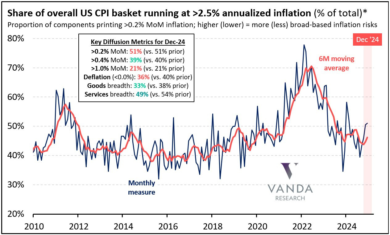 Trump wants lower inflation and, hence, lower yields, but he has a cause for worry. There are initial signs of inflation bottoming out, especially across Goods, as the diffusion metrics indicate that the items running at >0.2 % MoM have bottomed out at 51%.