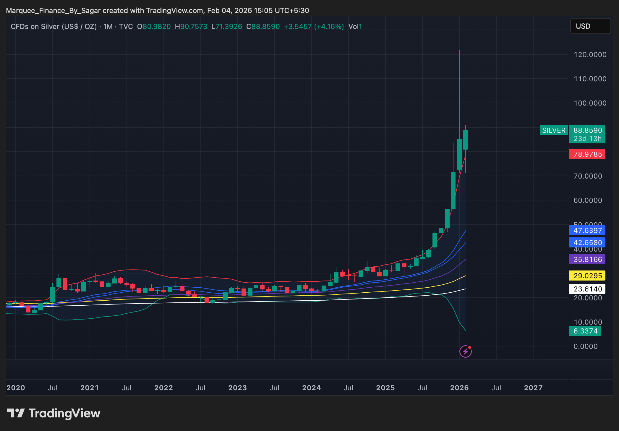 Nevertheless, despite an enormous 40% fall from the peak, Silver closed the month 19% up, and created history with 9 consecutive green candles and 6 consecutive closings above the upper Bollinger Band.