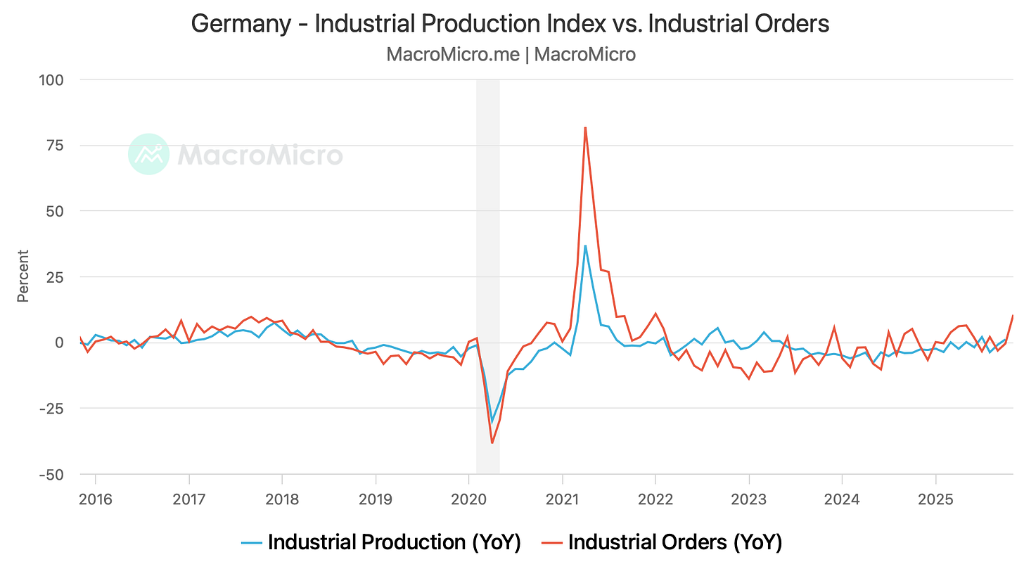 Across the Atlantic, industrial orders in Germany climbed by a whopping 5.6% MoM, led by large defence orders.