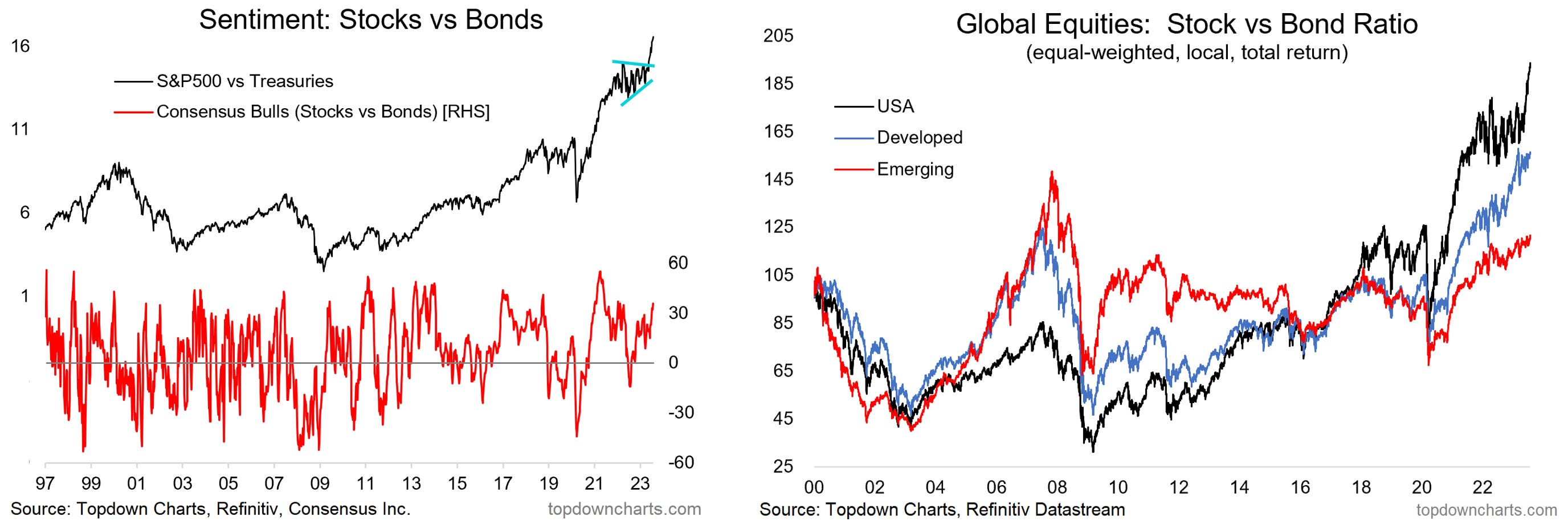 The surplus global liquidity means that stocks remain in a bull market, and sentiment is extremely bullish in favour of stocks compared to bonds.