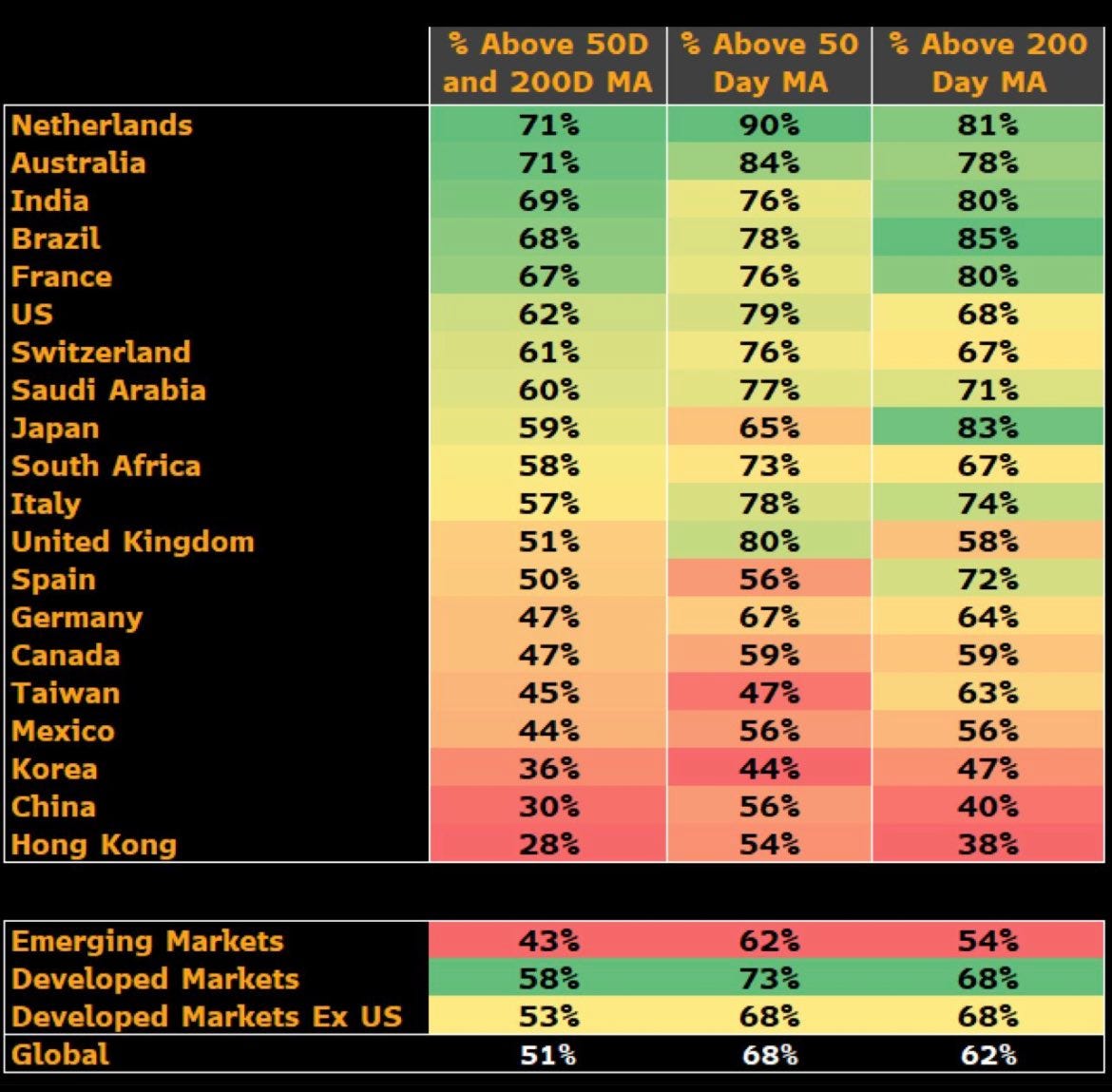 Except for China and Korea, the major equity markets portray an extremely bullish picture.