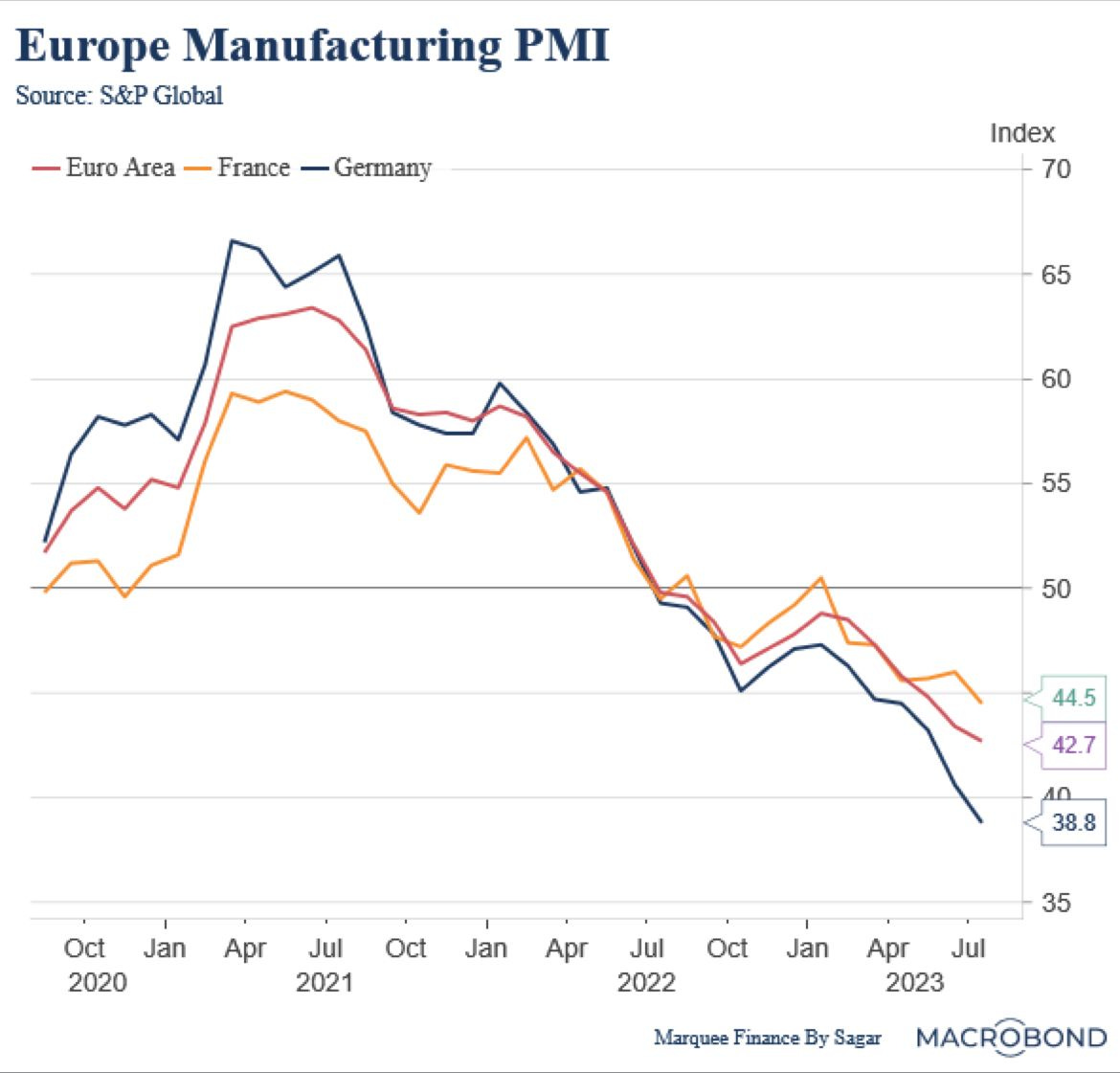 The US data is surprising on the upside, but the European data is deteriorating and shocking the market participants. The growth collapse is now visible all across Europe, led by the manufacturing giant Germany.