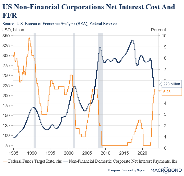 A much-anticipated recession never arrived in the US. While economists continue to scratch their heads for reasons, one of the most plausible reasons is that corporations benefit from lower interest rates (locking in for longer tenors) and earn handsome income from the highest levels of T-bills since 2001.