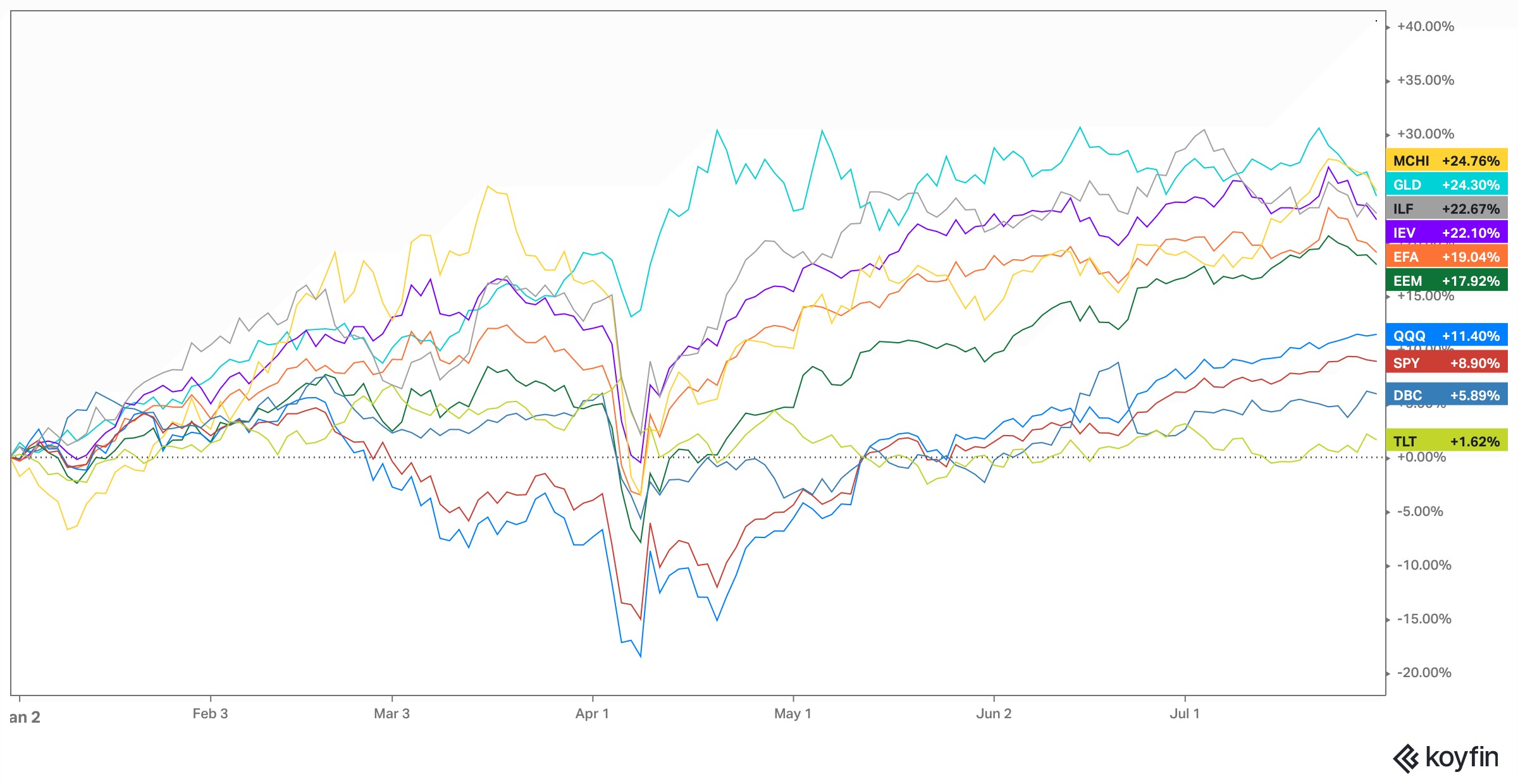 As the US equity markets led by the AI megacaps enter stealth mode, it has a long way to catch up to the global markets. Chinese benchmark ETF: MCHI is up by more than 24.7% YTD, beating the yellow shiny metal, which is up by 24.3% and has been on a tear due to the trade war and geopolitical situation.
