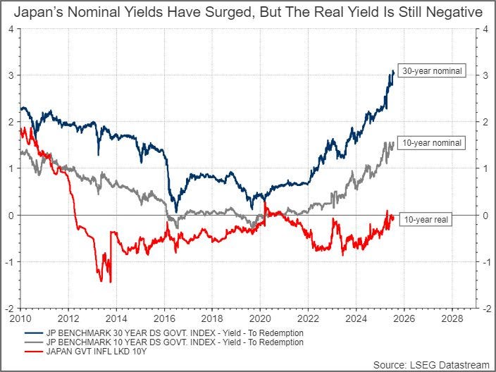The move led to similar moves in global bond markets. While the nominal yields have surged dramatically in Japan, the 10Y real yields (adjusted for inflation) are below the levels last seen in 2020.