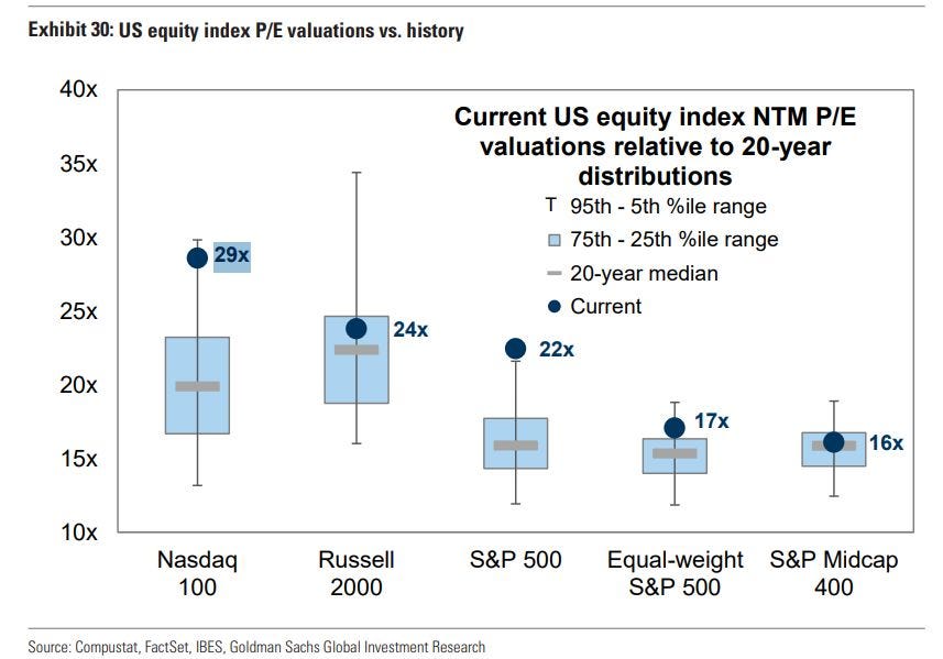 However, the equal-weight, small caps, and mid caps are fairly valued as they have been stark underperformers.