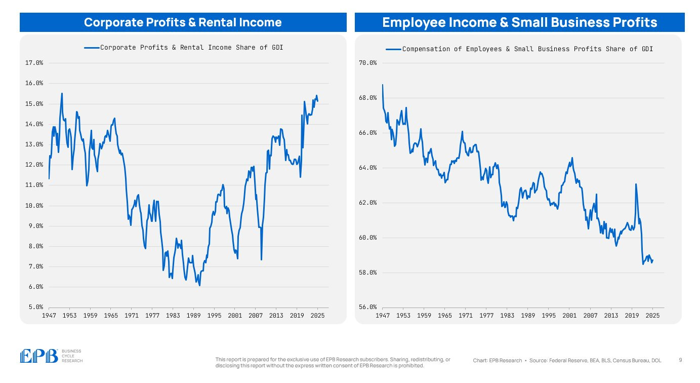 An eye-opening macro chart: A larger share of total income is now flowing to corporations and landlords, away from employees and small business profits.