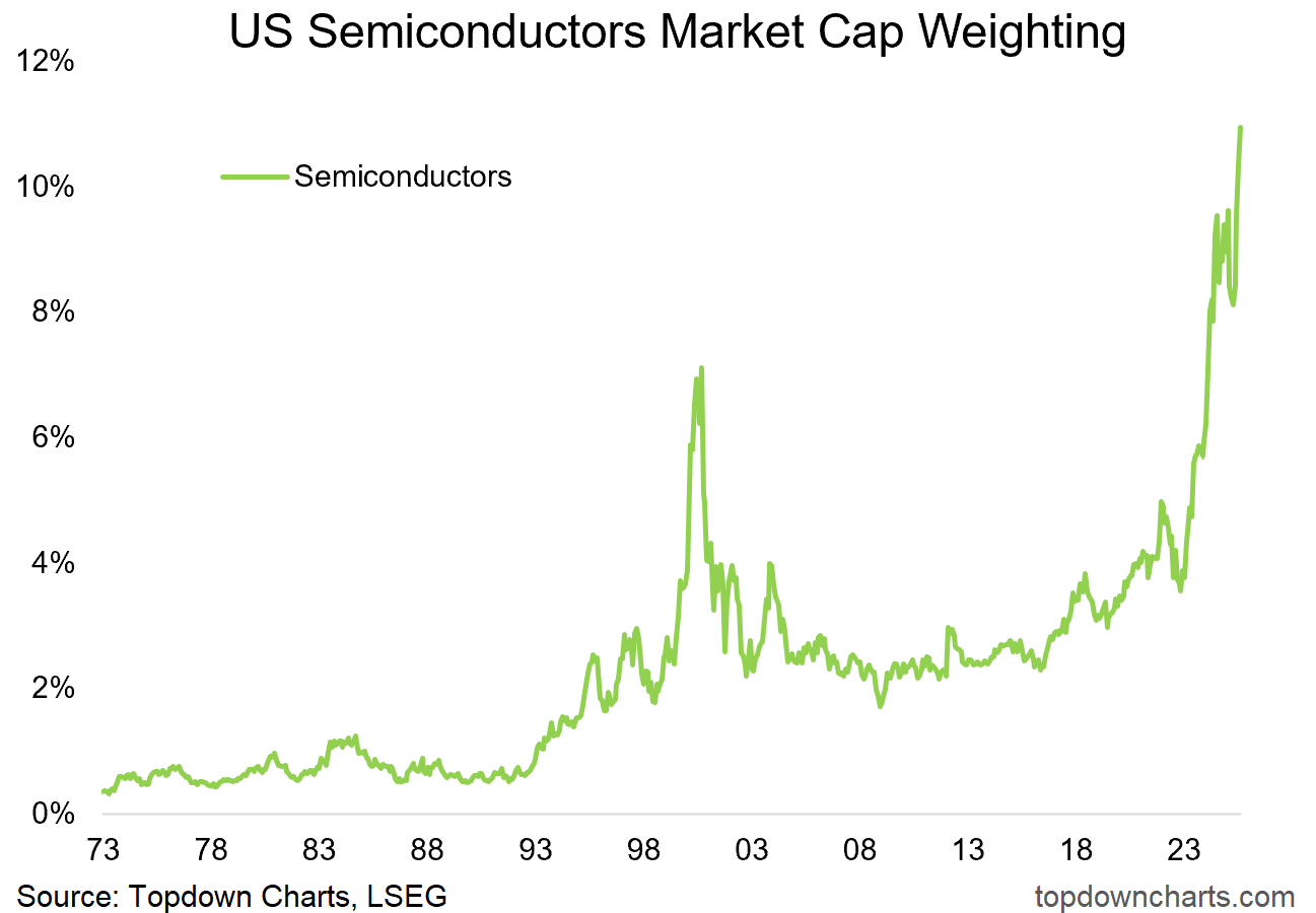 As a result, the US Semiconductors are now at a whooping 11% of the US market cap, the highest in history and even surpassing the 2001 dot-com bubble.