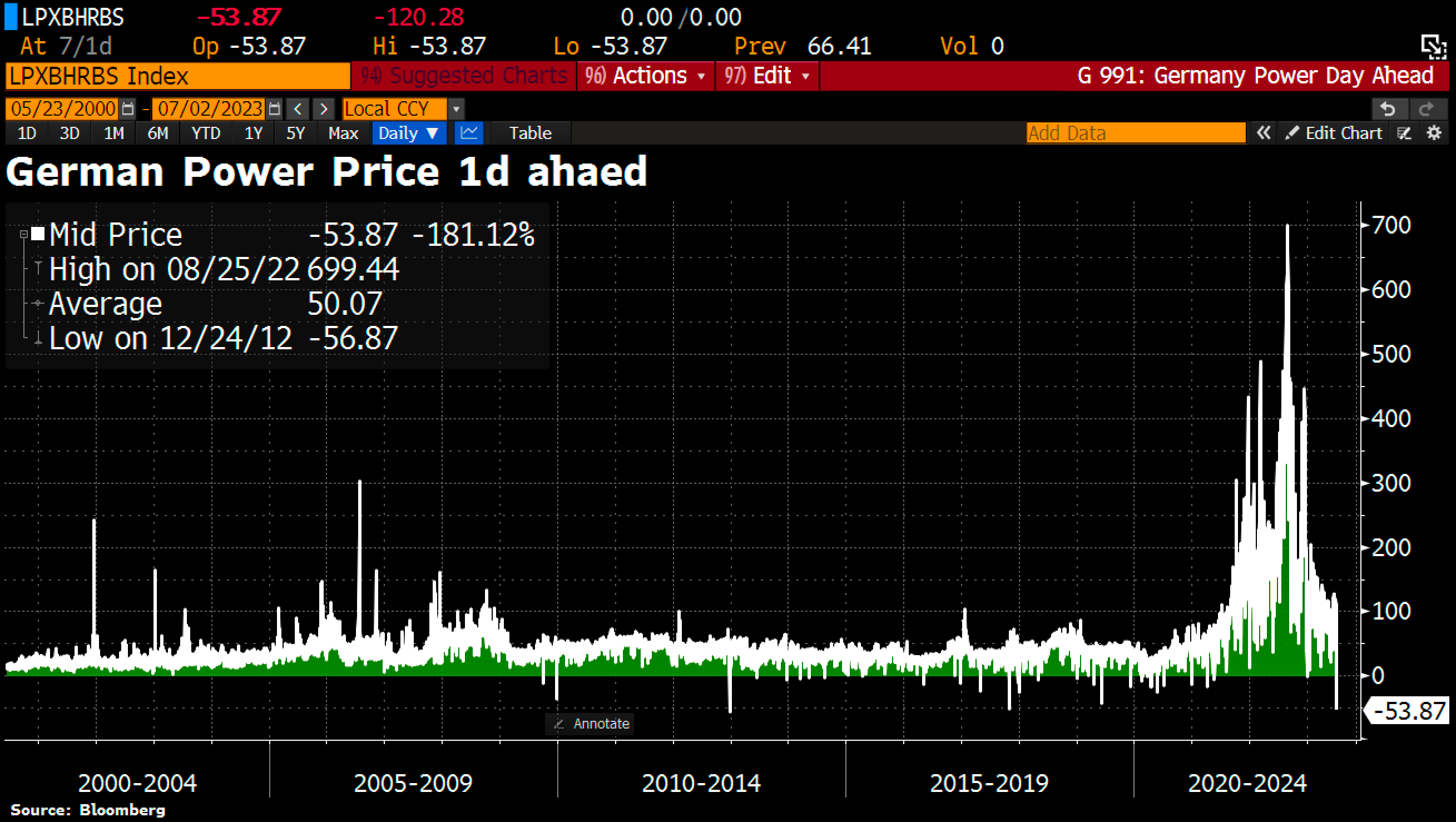 The “electricity” crisis is over as demand plummets and the storage levels remain higher at 80% across Germany. The 1day ahead power prices turned negative in the last week of June!