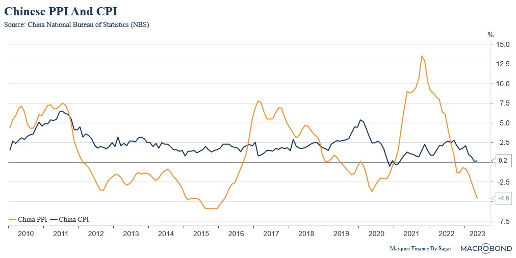 China struggles with deflation as the PPI tumbles to -4.6% and the CPI remains close to 0%.