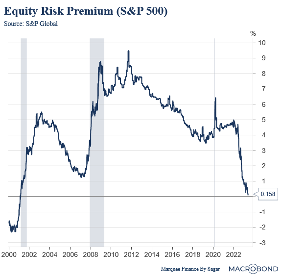 As the markets rallied hard, the equity risk premium crashed. We are on the verge of a negative equity risk premium, last seen during the dot-com bubble.