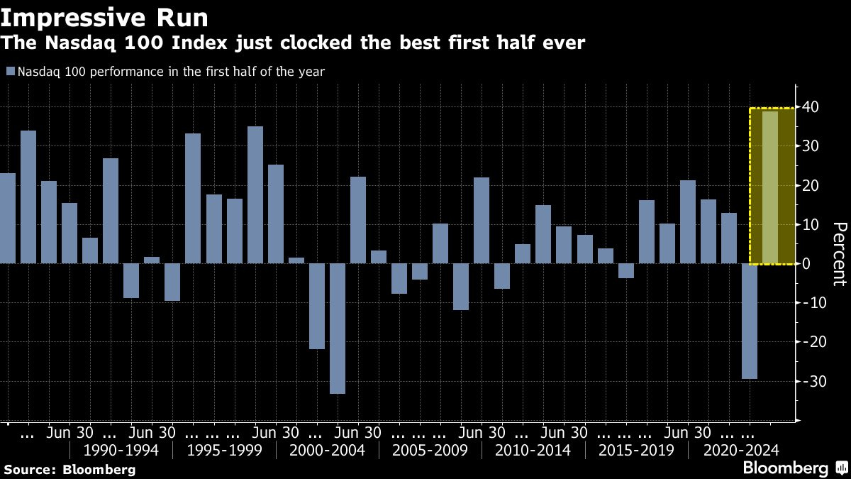 As a result of the market rally, the tech-heavy NASDAQ 100 clocked the best H1 “ever”.