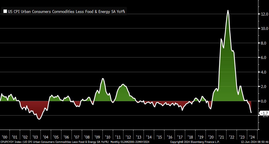 In fact, the fall in headline CPI is led by none other than the core goods inflation. The May reading of -1.7% was last observed two decades ago in 2003/04.