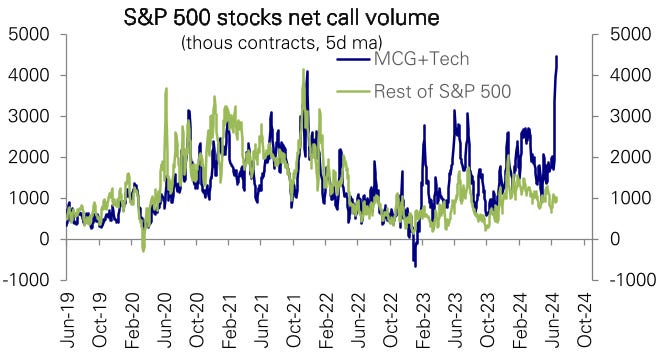 Net call volumes in mega-cap growth and Tech surged to record highs, surpassing even pandemic boom levels and completely disconnecting from those in the rest of the market.