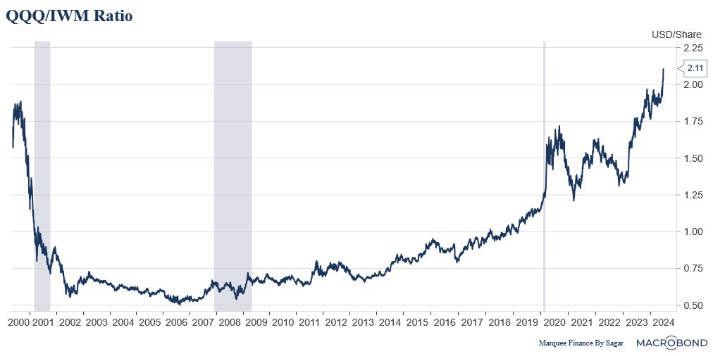 The AI Euphoria and the zombie nature of small caps have led to QQQs outperforming IWM by a gigantic margin. As a result, the QQQ/IWM ratio has crossed the dot-com bubble levels.