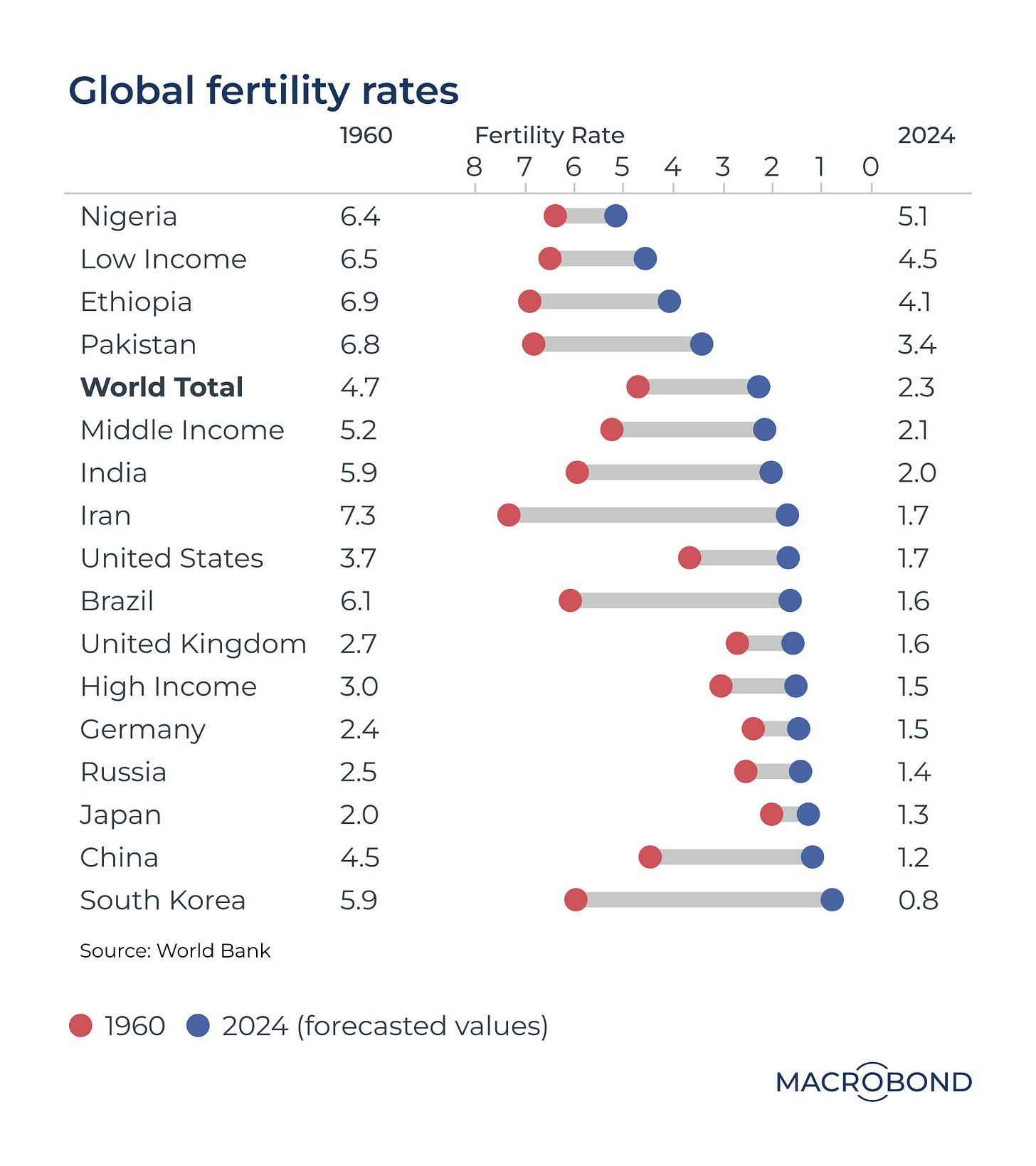 BONUS CHART: The world is on the verge of “Japanification” as many countries now have a total fertility rate (TFR) of less than 2.1, the replacement level for maintaining a stable population in most developed countries.