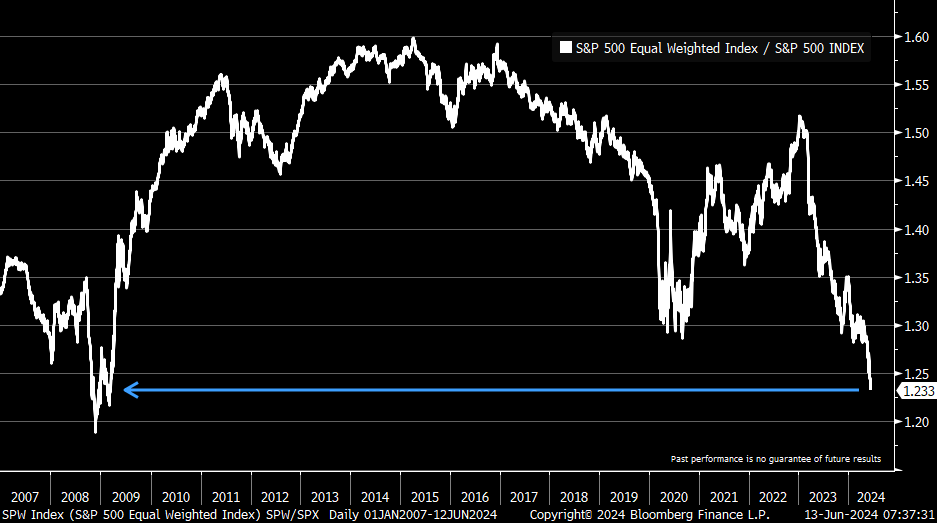 The RSP/SPY ratio has fallen to the GFC levels due to the mega tech rally of the last 18 months.