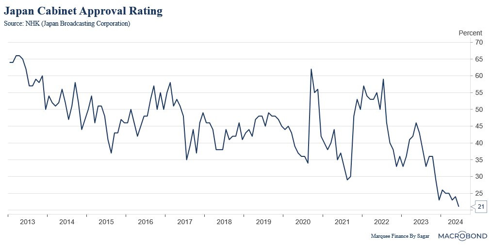 With imported inflation creating havoc for the Japanese problem, the Japan Cabinet Approval rating is at its lowest level.