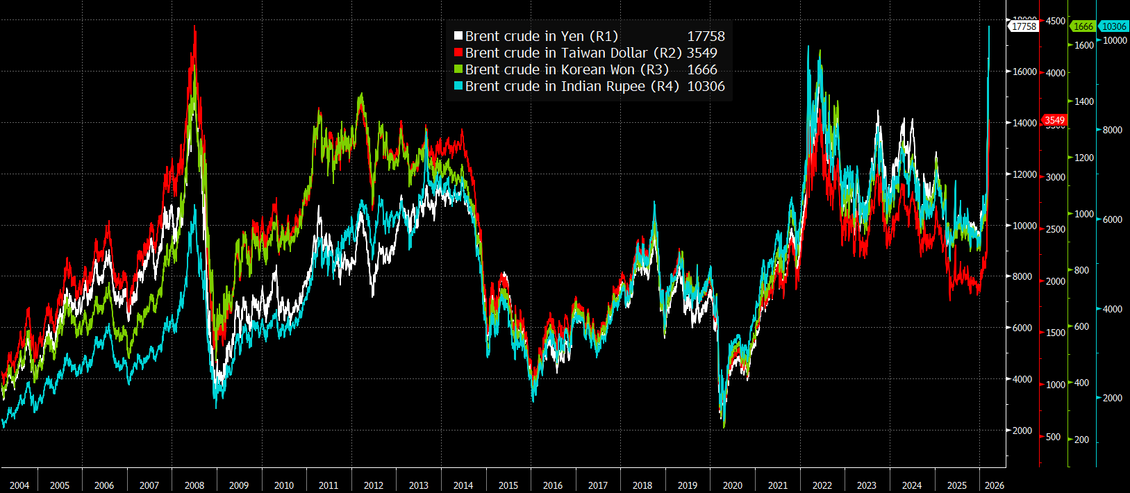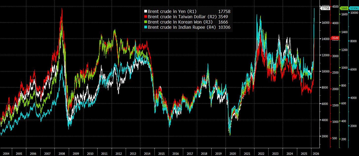 Ironically, except for the Taiwan Dollar ("heavily managed float"), among major non-China Asian economies, Brent crude has never been this expensive.