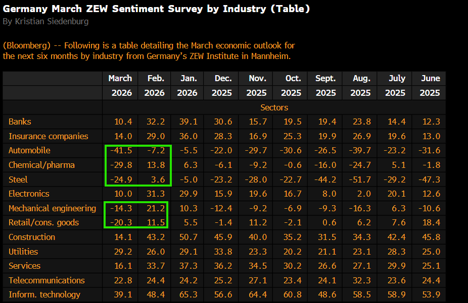 The war’s macroeconomic aftereffects were visible in Germany, with the latest ZEW Survey shocking the street. ZEW Economic Sentiment collapsed to the negative territory (-0.5) from 58.3 reported in February.
