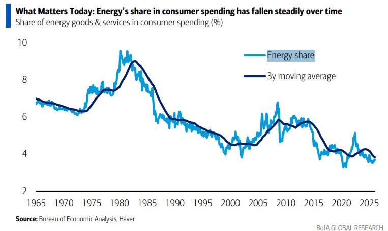Interestingly, energy’s share of consumer spending has fallen over the past few decades and is now less than 5%.