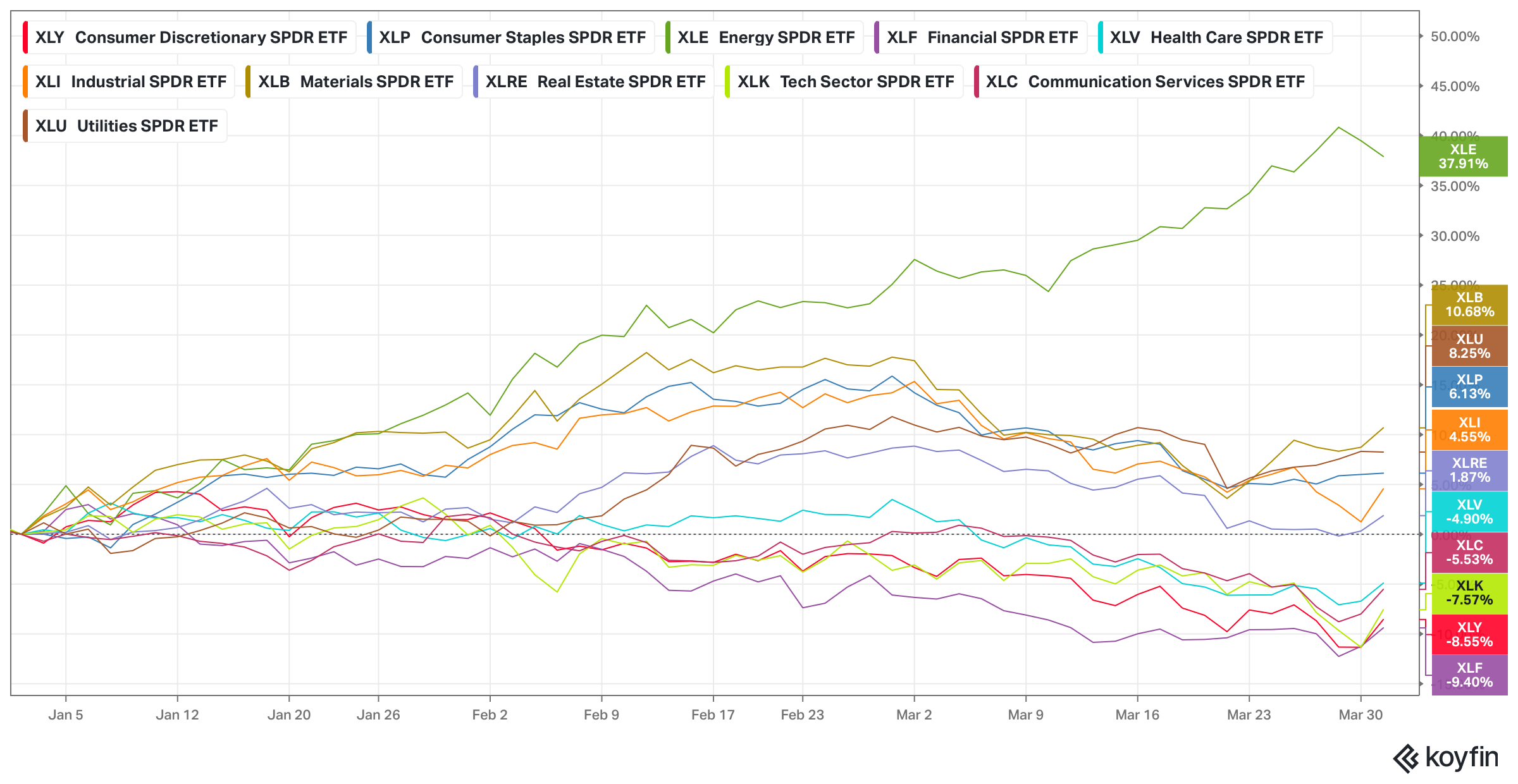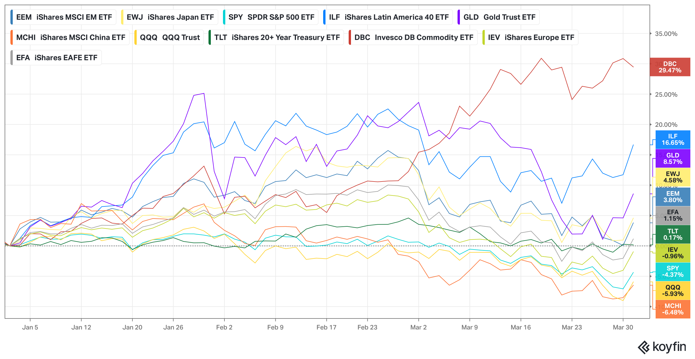 Led by a nearly 60% rise in crude oil prices in a single month, DBC is the top YTD performer.