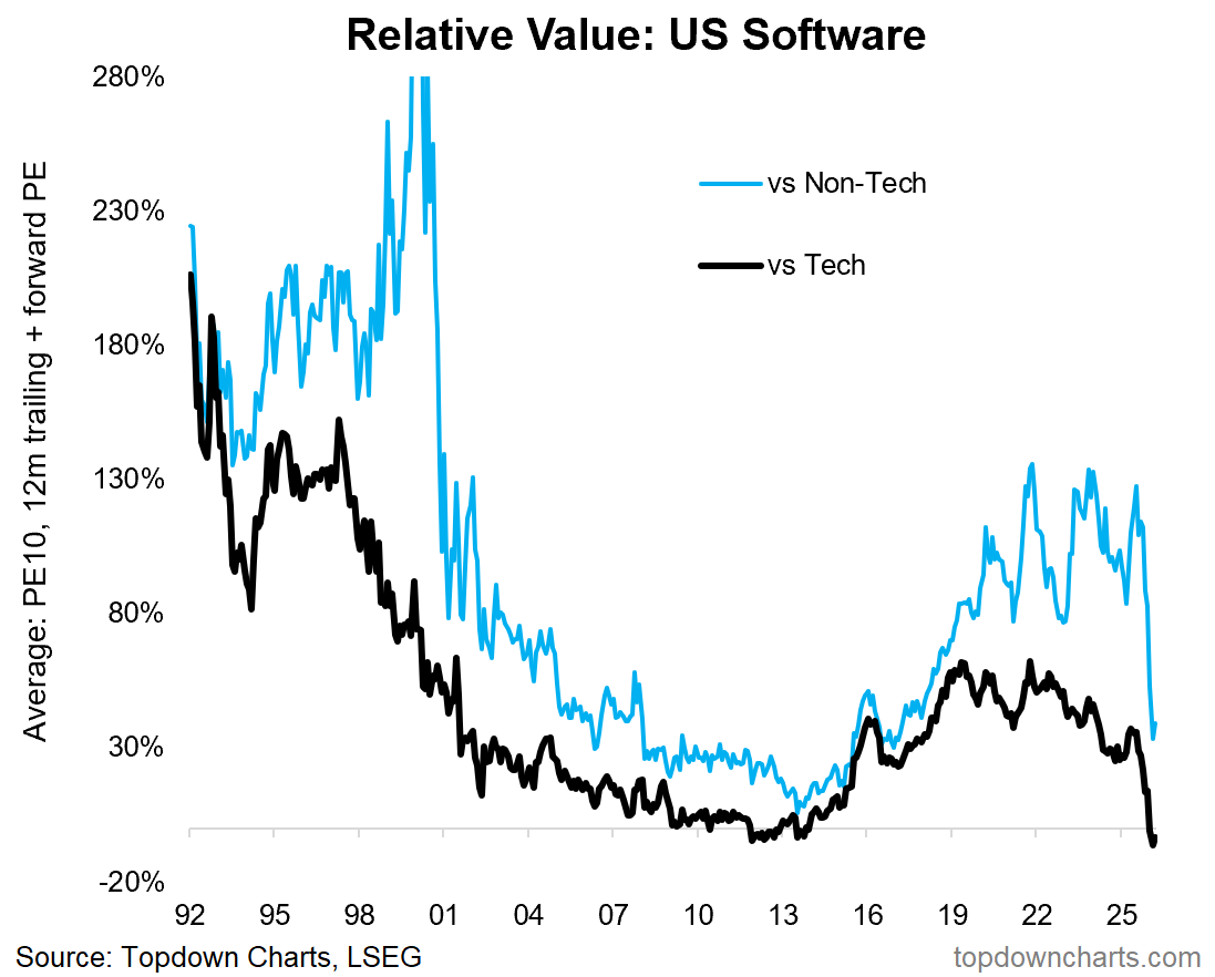 BONUS CHART: US software has witnessed a bloodbath as concerns rise post the release of Anthropic’s new models. As a result, US software v/s tech is now the cheapest on record.
