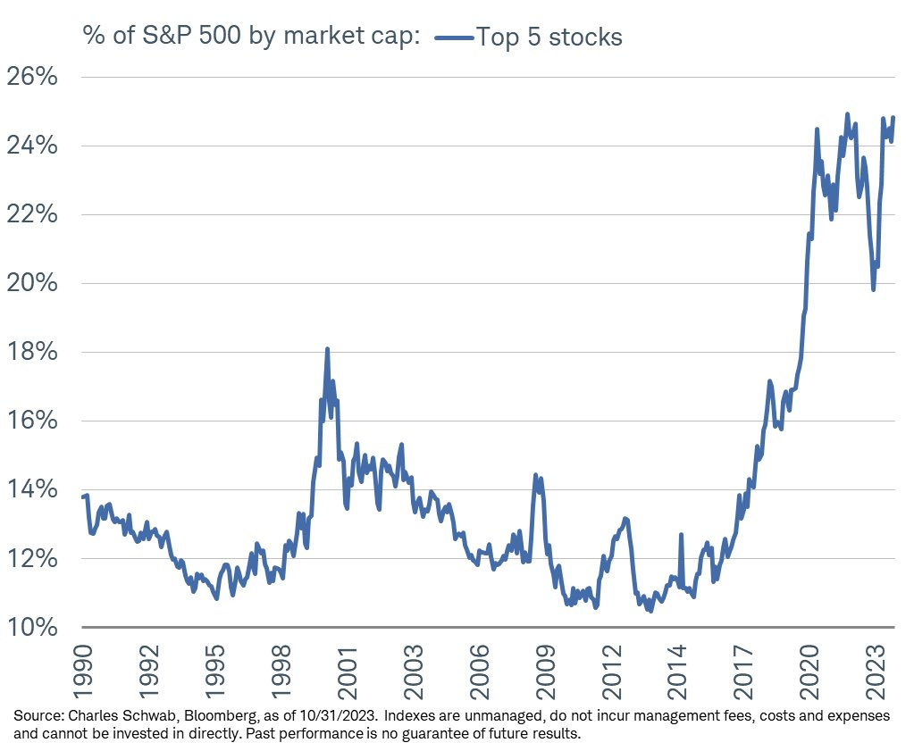 In fact, the top 5 stocks now account for roughly 25% of the weight back to its 2021 highs, which raises the concentration risk in the markets.