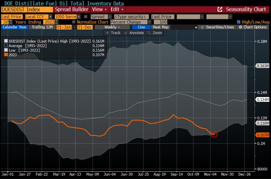 US stocks of distillate fuel (diesel and heating oil) are ending the fall season at their lowest “seasonal” level in data since 1982.