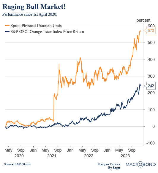 While “thinly” traded orange juice has seen an enormous rally due to supply-side concerns, the revival of the nuclear industry and underinvestment in Uranium mines has led to a gigantic bull run in Uranium.