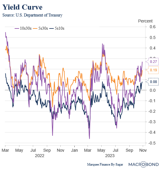 One of the rarest phenomena in the bond markets is the bear steepening, where the long-term yields rise more than the short-term yields. As the US macro data remains resilient, the yield curve witnessed a violent bear steepening in October.