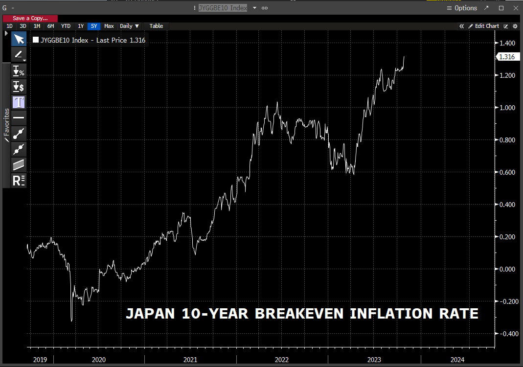 The inflation projections have been significantly revised upwards by the BoJ in its policy today, and the breakeven rates are flying.