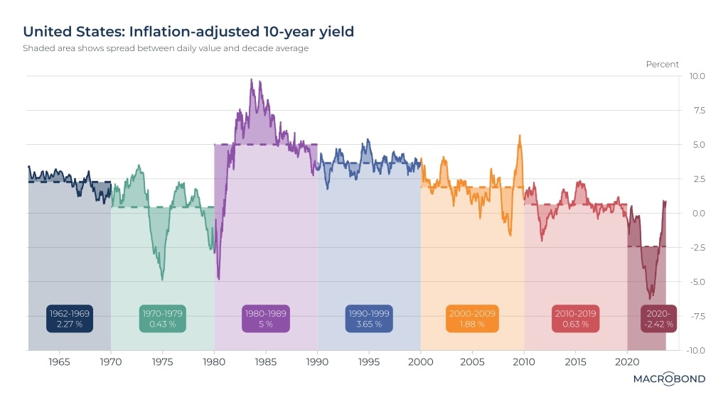 Real yields are calculated as = (nominal yields - inflation expectations). While the US 10Y yield flirted around 5%, the long-term inflation expectations have been well anchored at around 2.5%.
