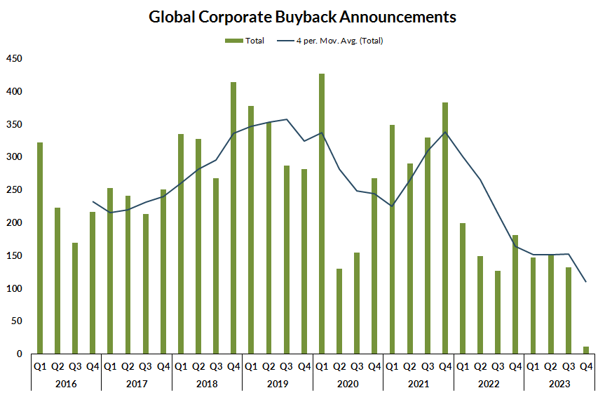 As we enter a high-interest rate regime, the corporate buybacks plunge lower as the luxury of borrowing and buying back evaporates.
