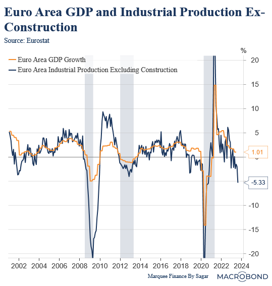 Europe has seen faster transmission of interest rates than the US. The result has been a sharp downturn in cyclical activity, with industrial production crashing.
