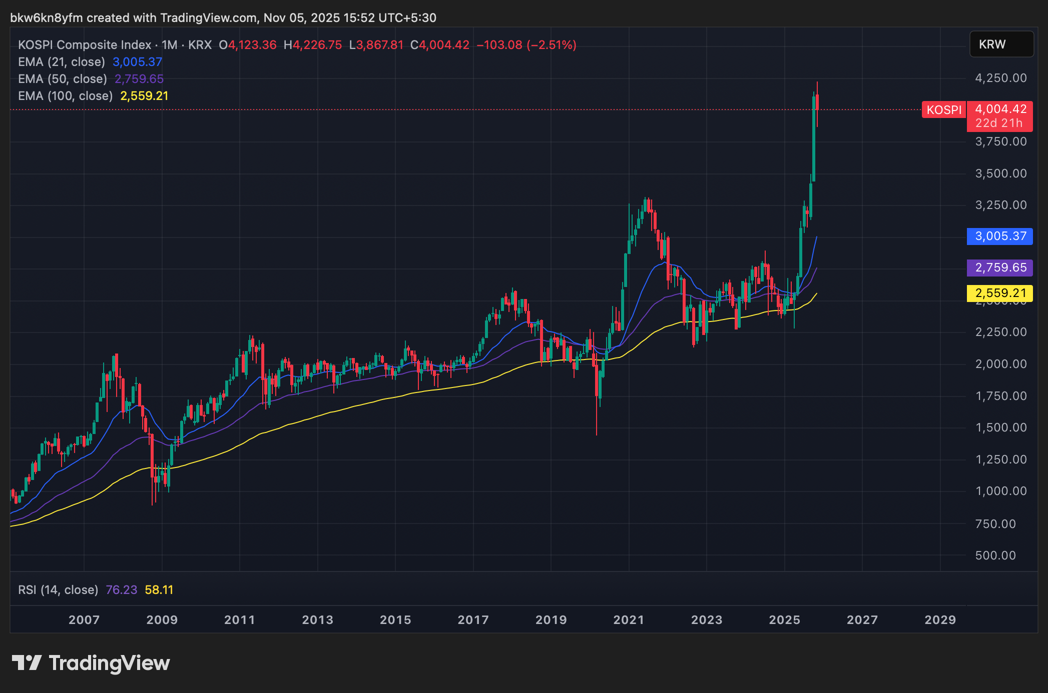 Kospi (South Korea’s benchmark index) underwent a monstrous breakout and was up nearly 20% last month, the highest since April 1999.