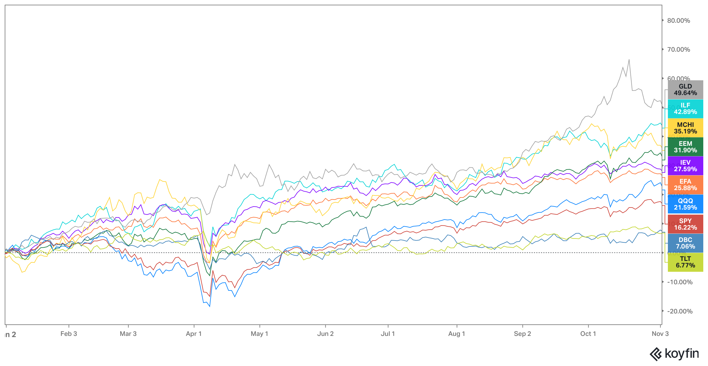 Due to various headwinds, long-term bonds remain the biggest underperformers, with the flagship TLT up only 7% (total return).