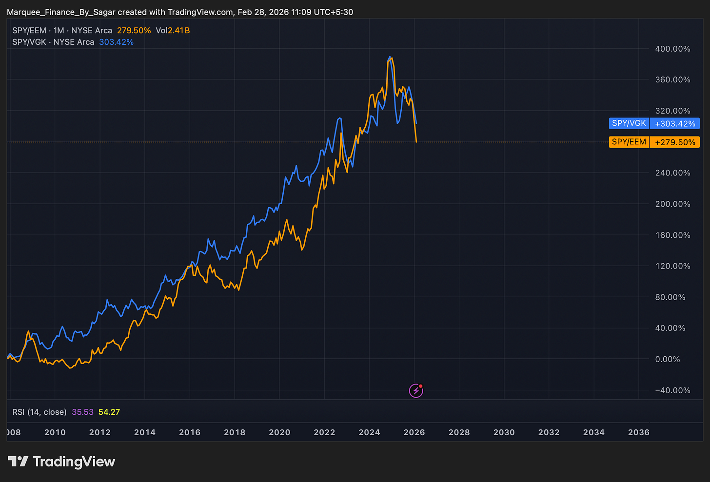 Since Liberation Day, we have seen peaks in the SPY/EEM and SPY/VGK ratios, indicating that Emerging Markets and Europe have outperformed the US.