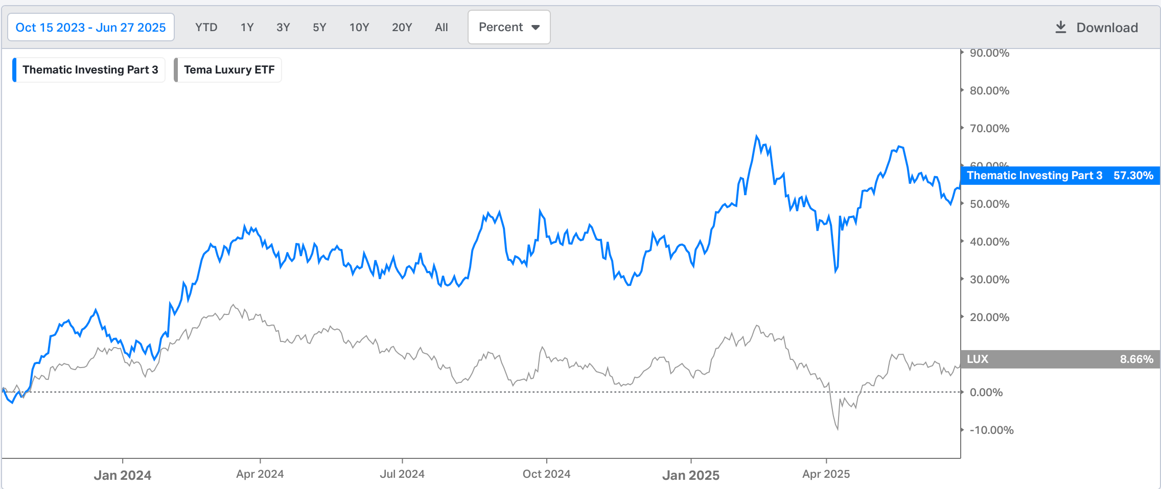 We are up 58% on Thematic Investing Part-3, outperforming the benchmark LUX ETF by a huge margin.