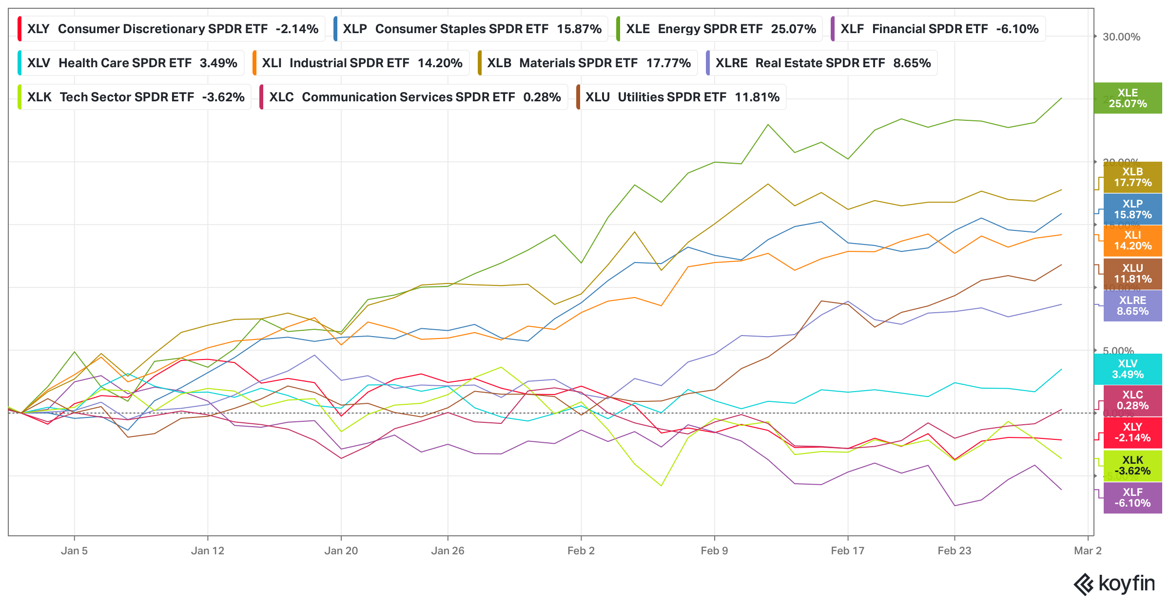 The energy sector has witnessed massive short covering and is the biggest gainer YTD (XLE is up 25%).