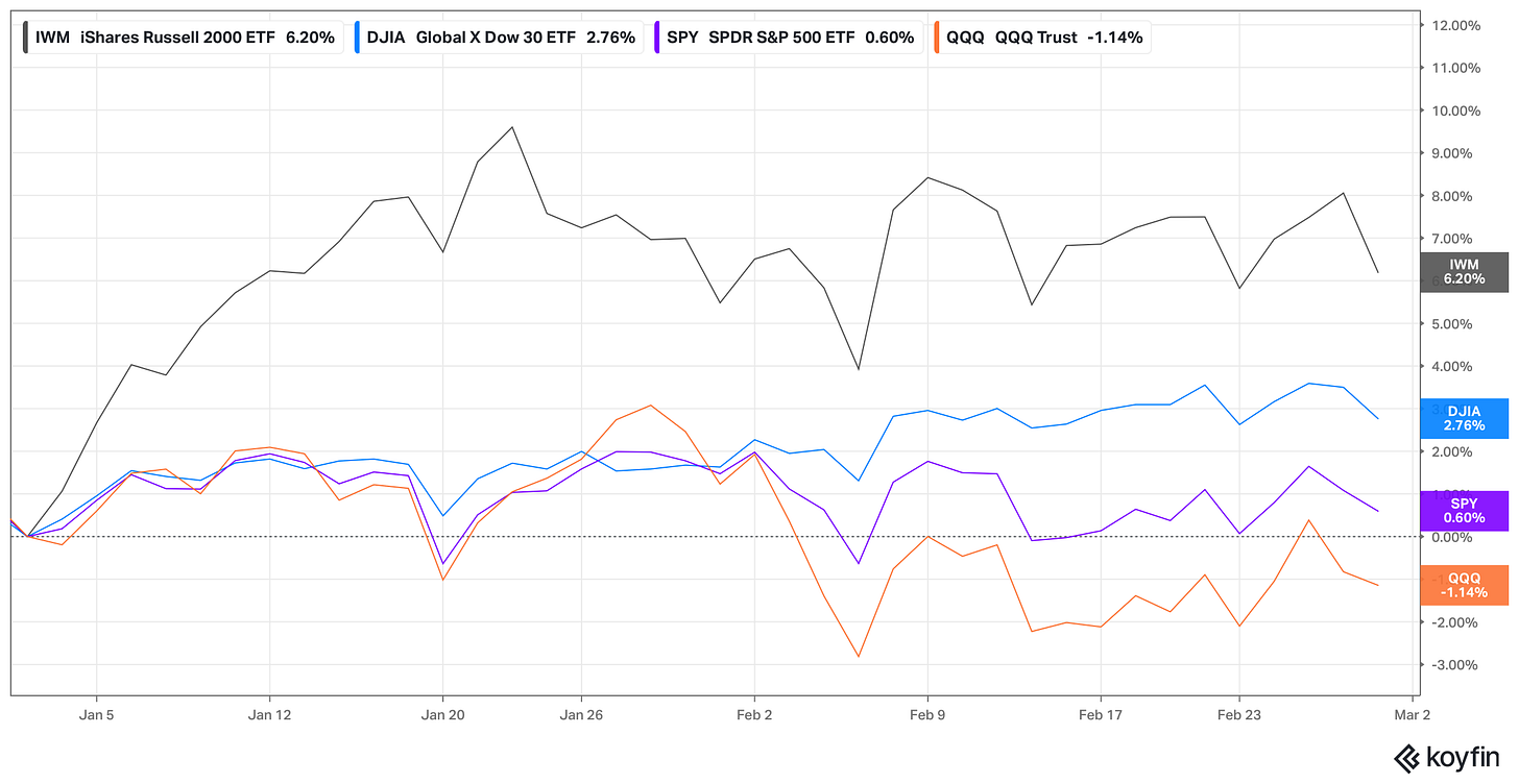 While the benchmark indices (S&P 500, NDX) are subdued, small caps and Dow Jones have been relative outperformers.