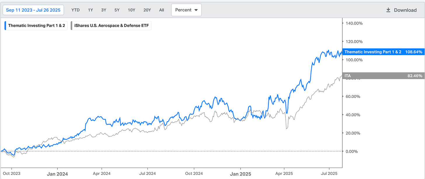 In Thematic Investing Part 1 & 2, we researched and analysed the Aerospace and Defence sector in detail and bought two stocks (it’s an equal-weight portfolio).