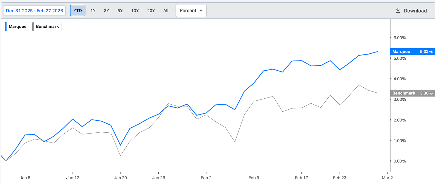 We closed at YTD highs and are up by 5.32%, compared to 3.3% for the benchmark.