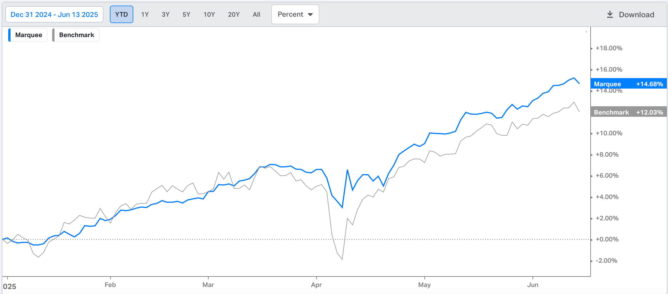 We continue to outperform the benchmark with a 14.68% YTD gain, outpacing its 12.03% performance by 250 bps.