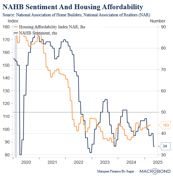 Sentiment and Affordability: In Real Estate (RE), sentiment drives the buyers (speculators, especially) to the asset class. Thus, one can’t ignore the fact that NAHB Sentiment (builder sentiment) dipped to one of the lowest levels since 2022. This will likely affect the future projects (slowdown expected). The affordability index is stagnant but at lower levels, as even with Fed rate cuts, the mortgage rates are super high, thanks to higher bond yields.