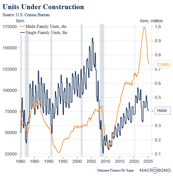 Units Under Construction: We have Permits→ Starts→ Units Under Construction. Unsurprisingly, units under construction have plummeted for Multi-Family Housing and Single-Family Housing. The plunge is stark in Multi-Family Housing, as we have mentioned in recent months, permits and starts have had a notable decline (as completions get expedited, we will see a further fall). In simple terms, the construction boom with all the PE money that began post-COVID in 2021 is ending. This will lead to a fall in construction jobs, which will appear in the jobs data in the coming months.