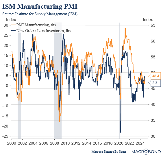 As with other market participants, our favourite indicator is New Orders less inventories, which leads the ISM headline number by a few months (3-4 months).