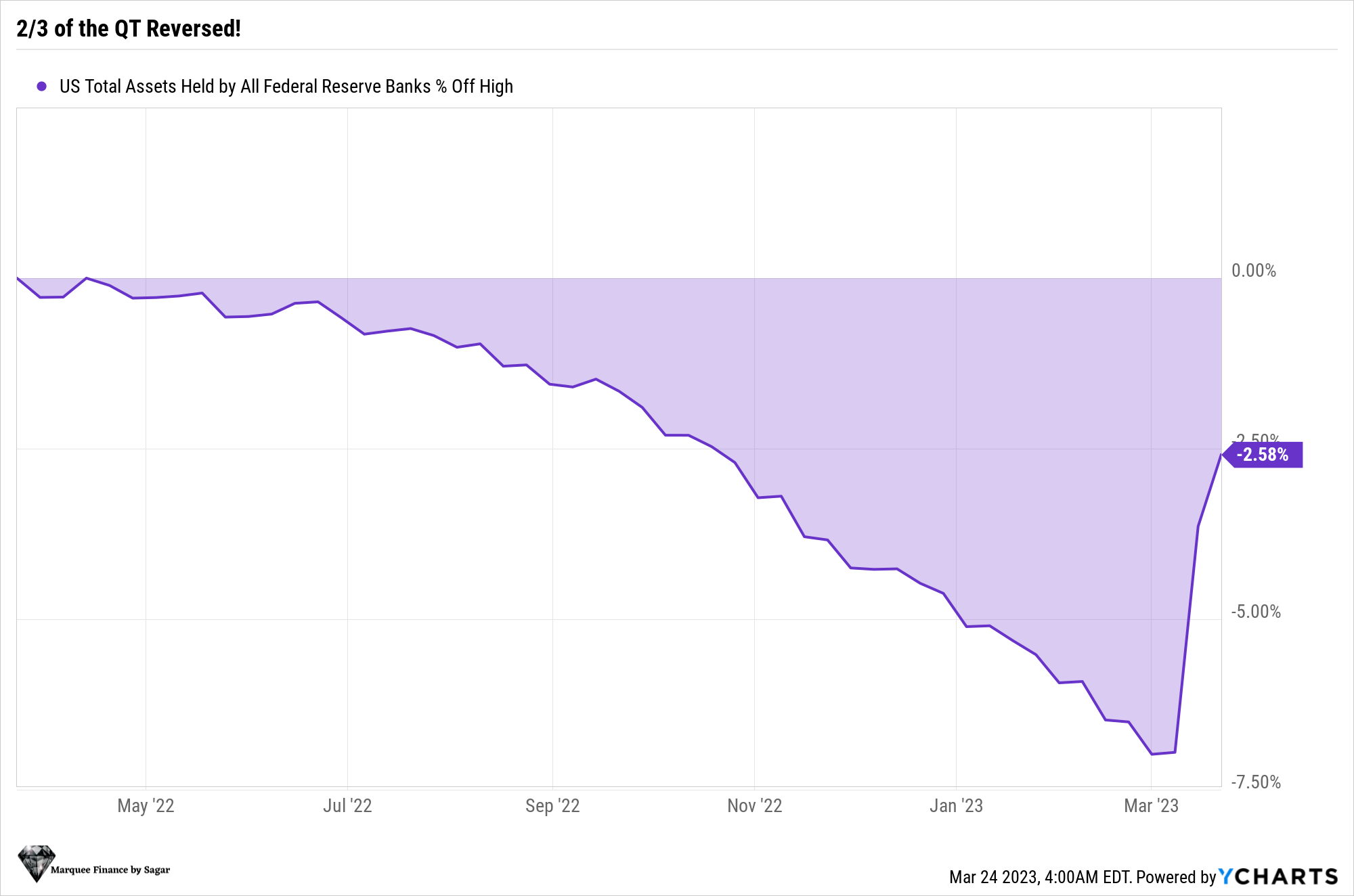 Ironically, as Ryan mentioned, 2/3 of the QT has been reversed, and the Fed’s balance sheet is now down by only 2.58% from the peak.