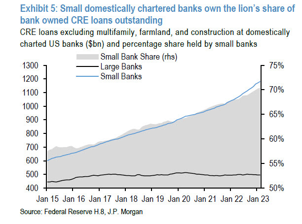 Ryan believes Q323 or Q124 will be when we see the maximum pain in the banking sector. This is because small banks account for the lion’s share (around 70%) of the total banking sector loans outstanding to the Commercial Real Estate Sector (CRE), leading to an enormous rise in loan loss provisions for the small banks as CRE loans go sour.